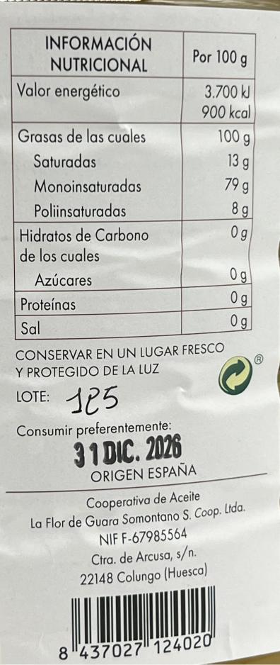 El aceite de oliva virgen extra Sierra de Guara pertenece a la D.O. aceite del Somontano. Destaca por elaborar el aceite principalmente por una variedad autóctona de la Sierra de Guara como es la Alquécerana. Esta es una variedad que produce aceites equilibrados con aromas a hierba verde y manzana. Los agricultores que elaboran este AOVE, pertenecen principalmente a la localidad de Salas.