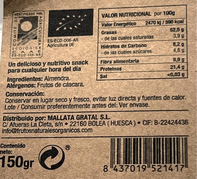 Almendras marcona, ecológica tostada y de la mejor calidad, y que cultivan en pequeñas fincas perfectas para su cultivo. Estas se encuentran a lo pies del pico Gratal, en la localidad de Bolea en la comarca de la Hoya de Huesca.