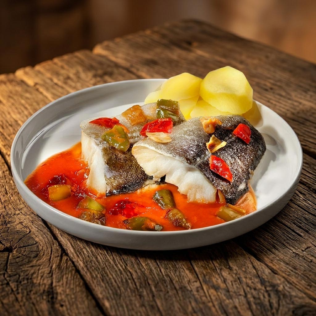 Una receta clásica de la cocina tradicional, llena de sabor y autenticidad. Nuestro bacalao, cuidadosamente seleccionado por su calidad, se cocina a la perfección con una salsa de tomate casera elaborada con ingredientes frescos y de proximidad. El pescado, tierno y jugoso, se integra con el tomate, creando un guiso sabroso y reconfortante.