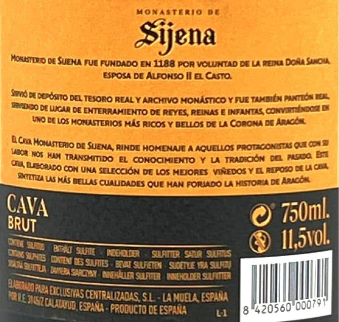 El cava Monasterio de Sijena Brut está elaborado por Bodegas Langa de Calatayud (Zaragoza). Elaborado con uvas macabeo/viura (75%) y chardonnay(25%). Es un brut con perfil seco pero con volumen y frescura equilibrada.