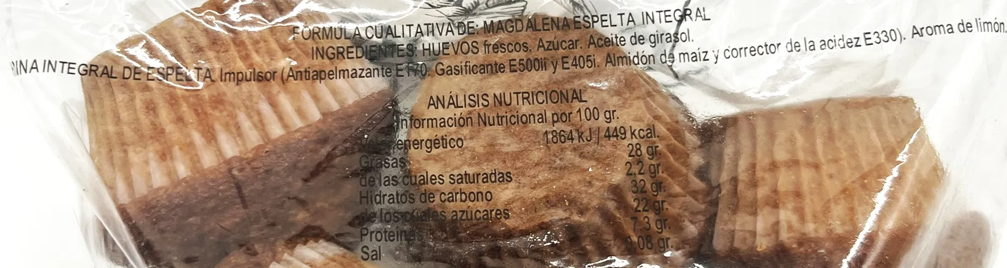 La magdalena de espelta integral es un producto elaborado con harina de espelta 100% integral. La espelta conserva el salvado y el germen, aportando mayor cantidad de fibra y micronutrientes(como magnesio y zinc) en comparación con el trigo refinado. Destaca por su contenido bajo en sal.