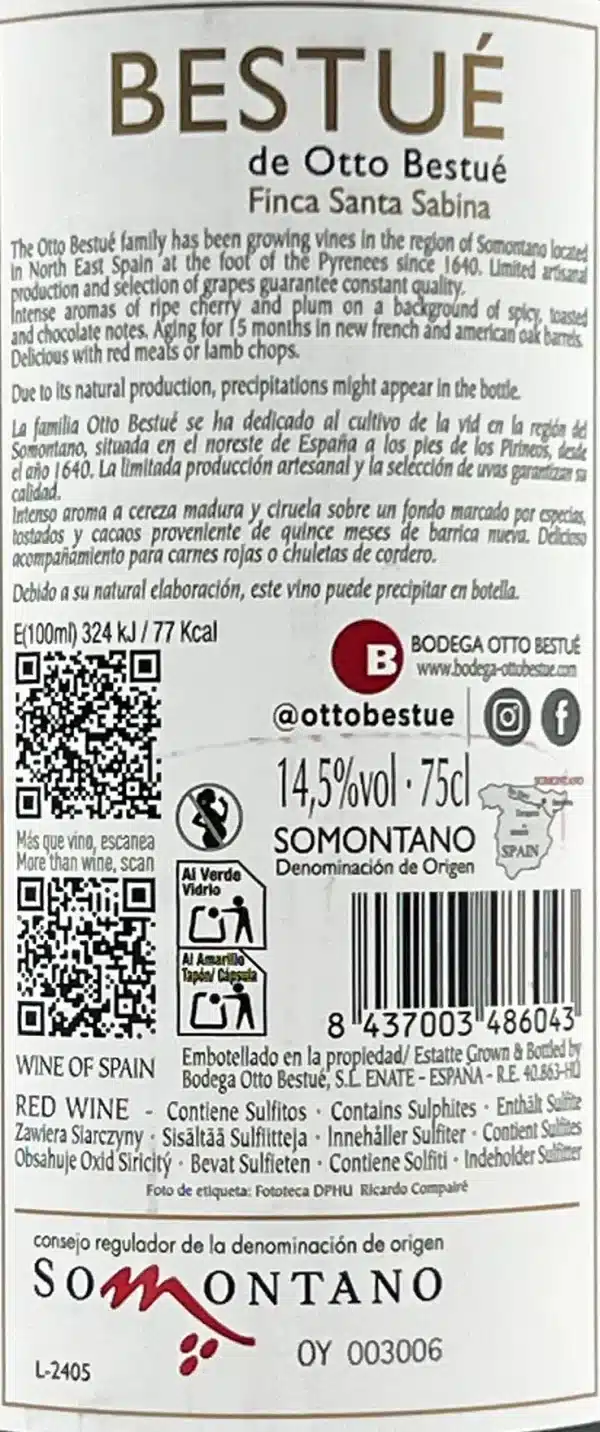 Bestué Finca Santa Sabina es un vinto tinto elaborado a partir de uvas Cabernet Sauvignon procedentes de nuestros viñedos situados en Enate (Huesca). Estructurado, carnoso y equilibrado, es un fantástico aliado de los guisos de carne y de los platos de cuchara contundentes.