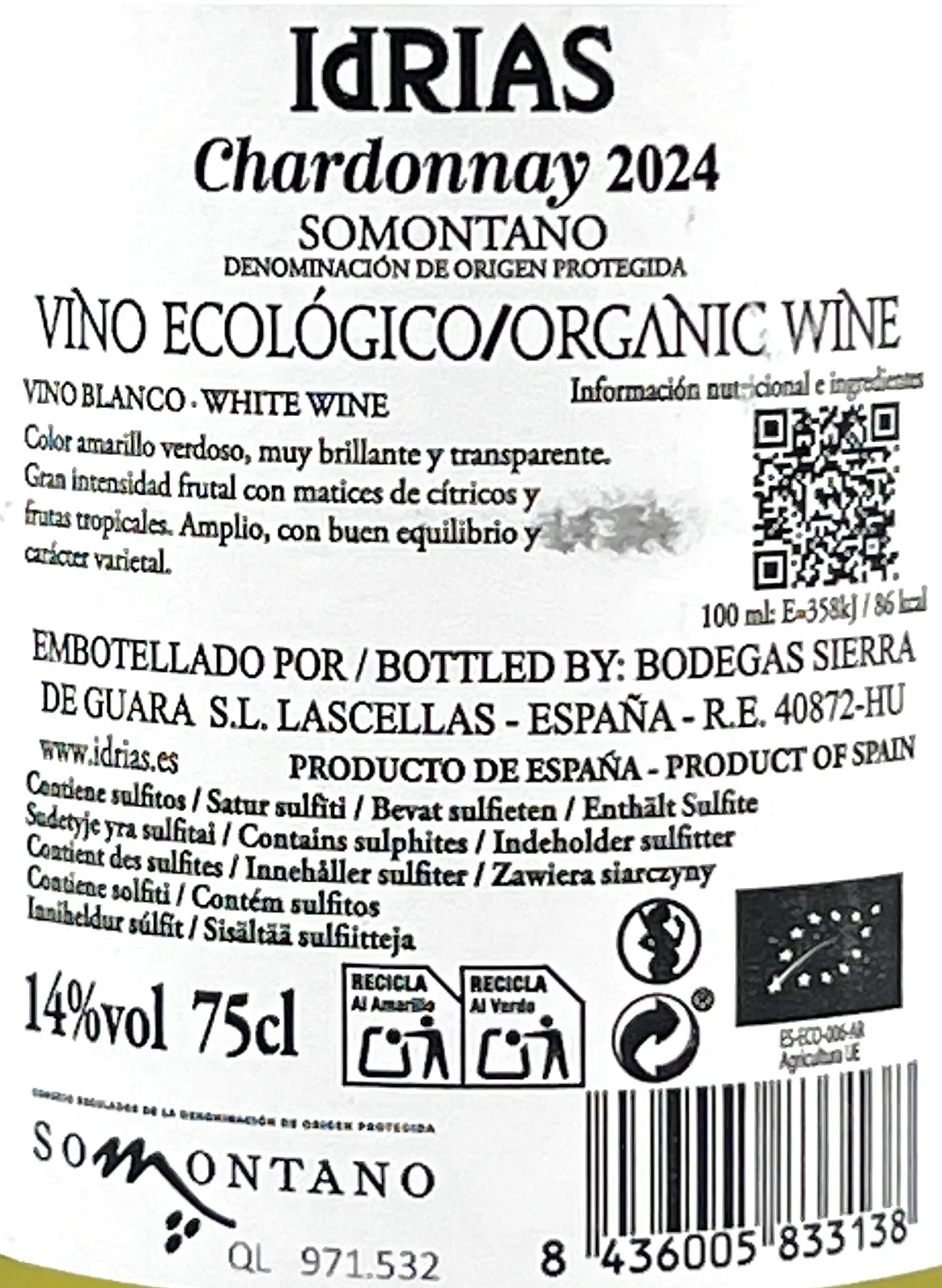 El Idrias Chardonnay ecológico es un vino blanco mono varietal elaborado en la D.O. Somontano (Huesca) por la bodega Sierra de Guara en la localidad de Ponzano en la comarca del Somontano.